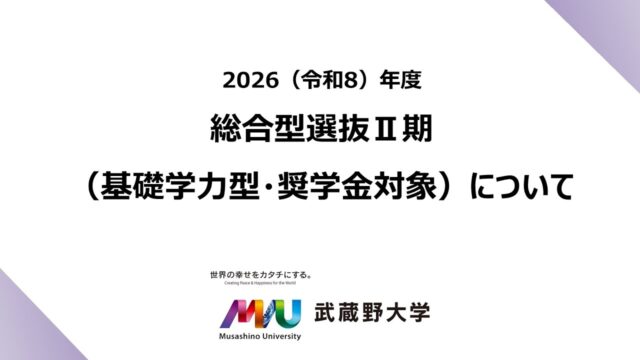 入試情報 【武蔵野大学】2026年度入試情報チャンネル ~総合型選抜Ⅱ期(基礎学力型・奨学金対象... 2026年度入試の総合型選抜Ⅱ期(基礎学力型・奨学金対象)についてご紹介します。 ▼総合型選抜 ~合格者に… 2025.10.02